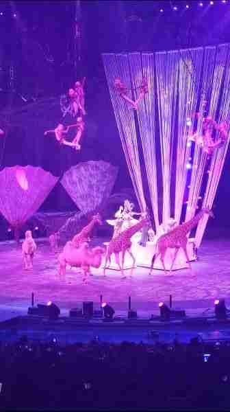 Dromadaire et girafes au milieu des acrobates