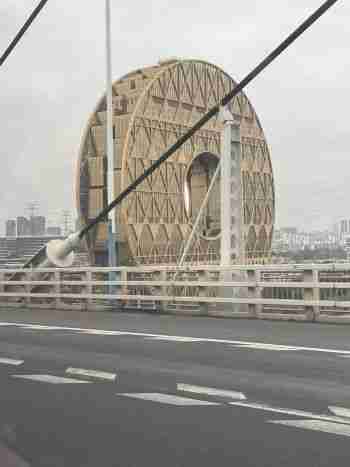 Et là, sur le chemin qui nous mène à la gare de Guanzhou, découverte à l’horizon d’un building étonnantcirculaire, énorme, 168 mètres de haut. Siège social du groupe Hongda Xingye, il est l’œuvre d’un architecte italien qui se serait inspiré du disque bi chinois, troué en son centre. Placé tout près de la rivière, le bâtiment s’y reflète et forme en plein jour un 8, chiffre porte-bonheur des chinois !