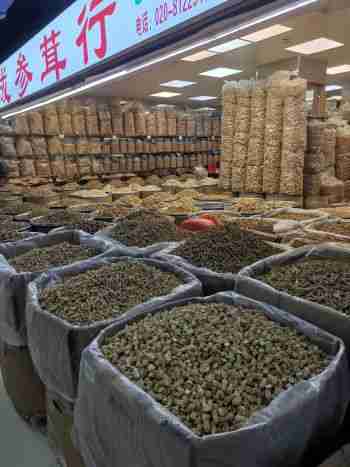 A deux pas de l’hôtel où nous séjournions, se trouve le marché de Qingping, une véritable institution à Ghuanzhou. Ni légumes, ni fruits, mais des plantes des insectes des animaux séchés dans des quantités pharaoniques pour soigner tous les maux. C’est le temple de la médecine chinoise (le plus grand de Chine) et il déborde de champignons, de graines de lotus, de concombres de mer, de scorpions, de crapauds… et d’hippocampes (pour soigner la toux, paraît-il).