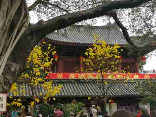 Le temple de la brillante piété filiale est l’un des plus vieux édifices de la ville, même s’il a été en partie reconstruit au fil des siècles. On y trouve de belles pagodes et – au moment de notre visite – des arbres absolument somptueux garnis de fleurs jaunes … Miracle de la nature visiblement apprécié des très très nombreux pèlerins chinois qui prennent selfies et photos. Un vrai spectacle.