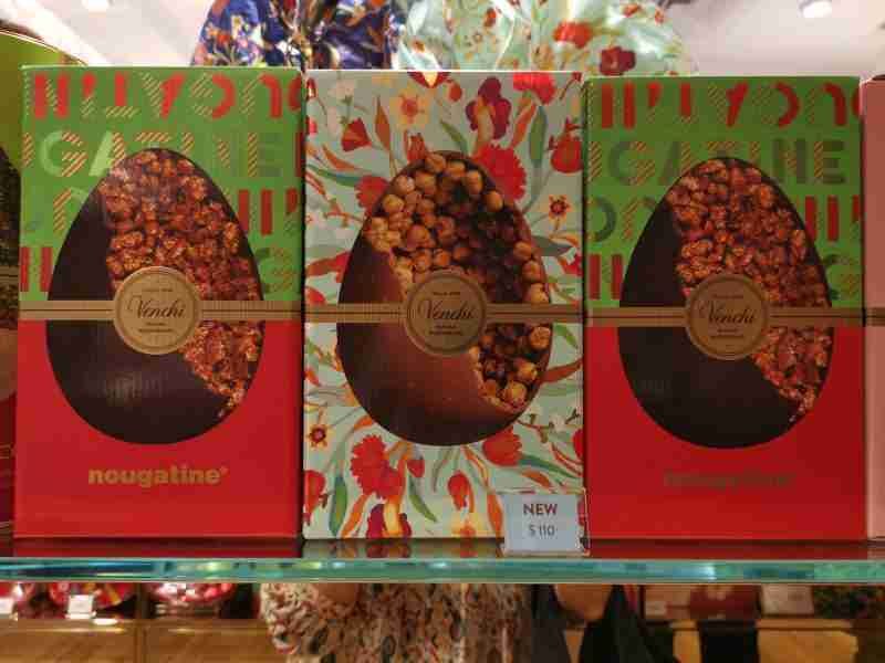 Chez le suisse Läderach, quelques œufs et des lapins roses dispos en ligne, chez le belge Godiva un œuf dont l’esthétique « spring » devrait ravir la clientèle locale. Pour le choix et la créativité, il faut aller chez l’italien Venchi. Je craquerais volontiers pour ses gros œufs nougatine dont je regrette qu’ils soient vides !