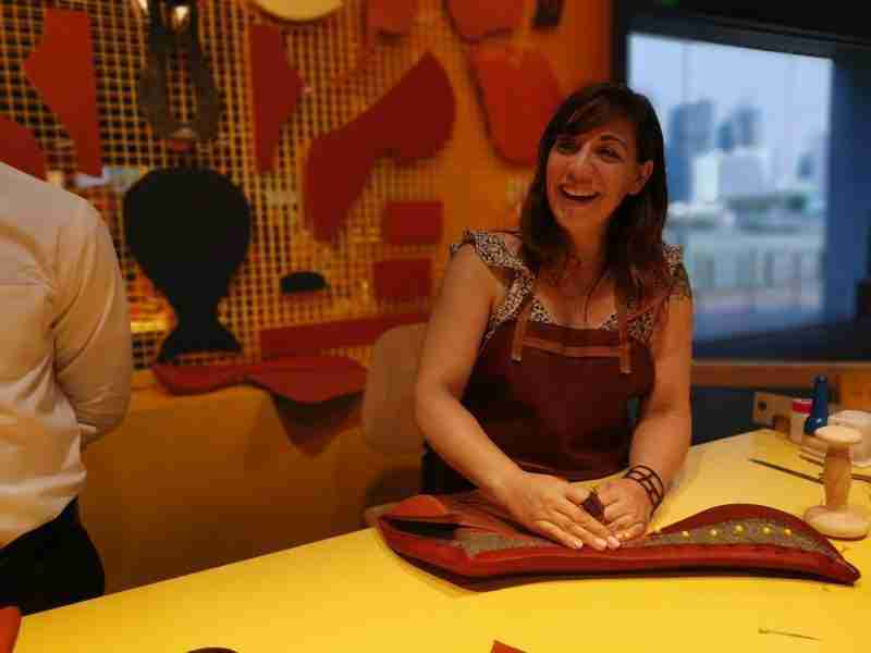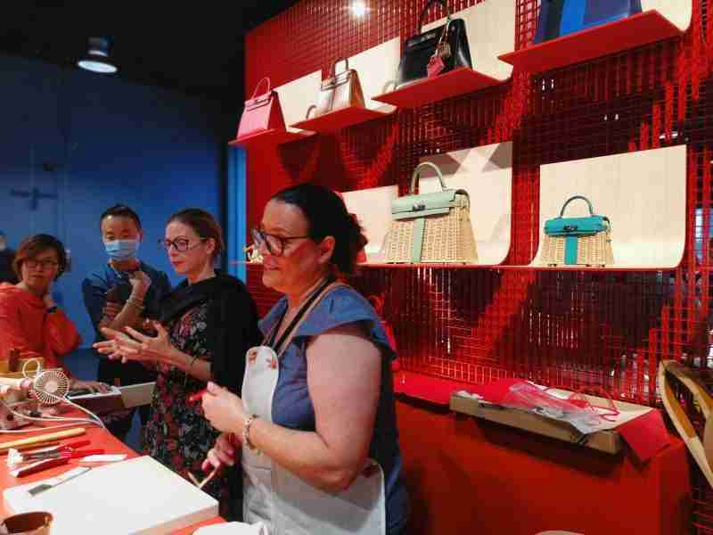 Dix métiers sont représentés et pour chacun un artisan de la Maison offre une démonstration de son savoir-faire. Les Singapouriens se pressent, curieux de découvrir l’envers du décor de leur sac! Aux côtés des hommes et des femmes de l’art, des interprètes facilitent les échanges. Notre chance, c’est de pouvoir traiter en direct. Parler français, c’est un luxe qui ne se refuse pas! J’ai choisi d’aller à la rencontre de la sellière dont l’aiguille était aussi longue que mon doigt, de la maroquinière qui terminait un sac Kelly 3D rouge cœur, de l’artisan graveur dont j’ai bu les paroles.