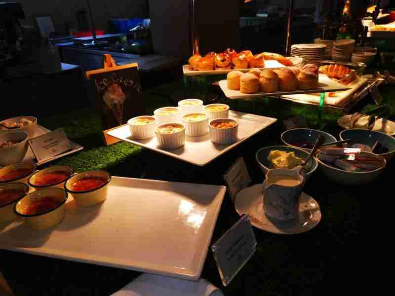 Après avoir passé commande de nos boissons, nous avons fait nos allers retours au buffet salé où nous avons rempli nos assiettes : croissants garnis, beignets de fruits de mer, quiches et canapés divers, crèmes brulées, viandes et poissons en sauces, quelques spécialités locales…La variété est au rendez-vous mais l’assortiment est sans surprise ou presque. La présence insolite d’un cassoulet est tout de même à noter ! Les traditionnels scones sont moelleux à souhait.