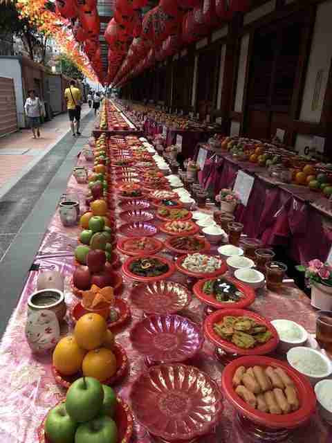 D’autres offrandes comprennent des buffets en plein air de fruits frais, de cochons de lait et du riz.