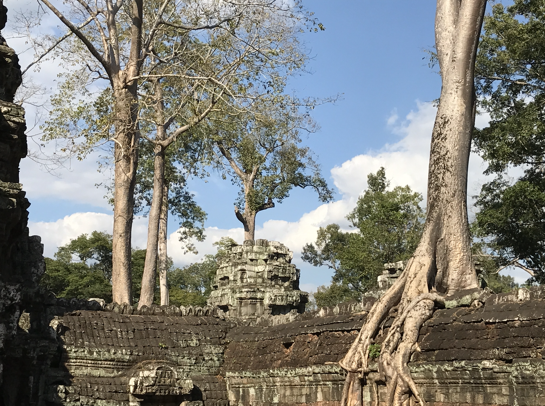 Le temple Ta Prohm s’est rendu célèbre dans les jeux video et les films Lara Croft. Niché dans les jungles de Siem Reap, à quelques kilomètres à l’Est d’Angkor Wat. À la différence de la plupart des autres temples d’Angkor, le temple de Ta Prohm a été laissé dans un état proche de celui de sa découverte (début du 20e s.) La nature semble avoir repris le dessus avec les racines des arbres chevauchant les murs, disjoignant des blocs de grès des sanctuaires où pénètrent dans les galeries voûtées…