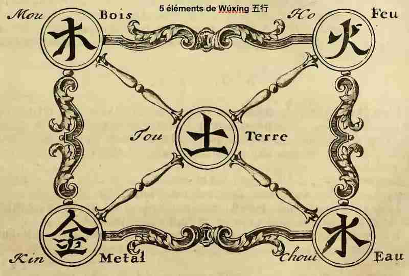 - Wúxíng 五行 : cinq phases, qualités ou mouvements, emblématiques des mutations et changements de l’univers, ainsi que leurs interactions.