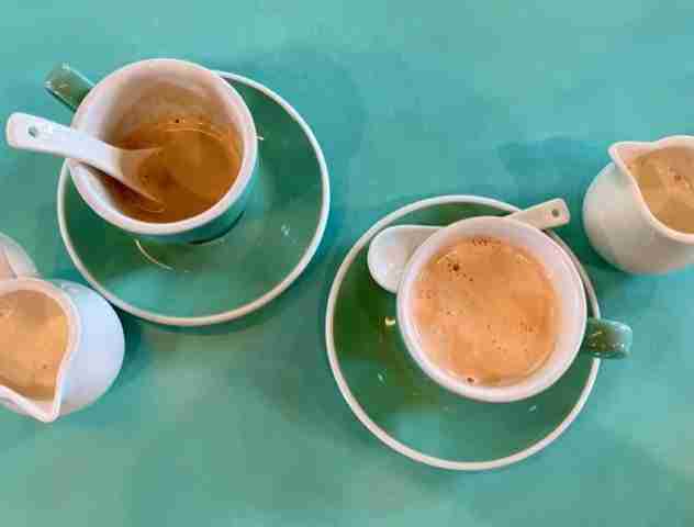 Si on vous le sert dans une tasse sentez-vous chanceux. Car certains restaurants, cafés, ou de mes copines le servent de façon traditionnelle : une tasse métallique avec une soucoupe à haut rebord sans cuillère – même si vous voulez y ajouter du sucre! La boisson sera servie brulante et pour la refroidir et/ou mélanger le sucre, c’est à vous de la transvaser en mouvements réguliers de la tasse à la soucoupe et vis versa. Il va sans dire qu’il faut une certaine dexterité et de l’entrainement pour y arriver sans en mettre partout.