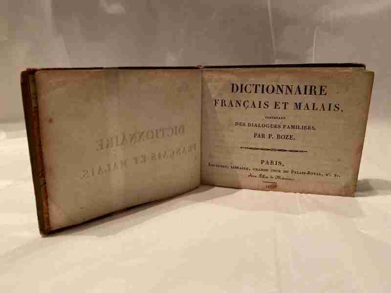 Le premier dictionnaire Français-Malais est publié à Paris en 1825. Un exemplaire est exposé dans une vitrine au rez-de-chaussée. Pour mémoire : Raffles est arrivé à Singapour 6 ans plus tôt. Il faut aussi savoir que le malais est à l’époque la lingua franca de l’archipel c.a.d. la langue véhiculaire d’Asie du Sud-Est. Le but de tout dictionnaire bilingue est avant tout utilitaire. Les dialogues-types sont censés être ceux indispensables pour mener à bien des transactions commerciales ou gérer des situations de la vie de tous les jours.