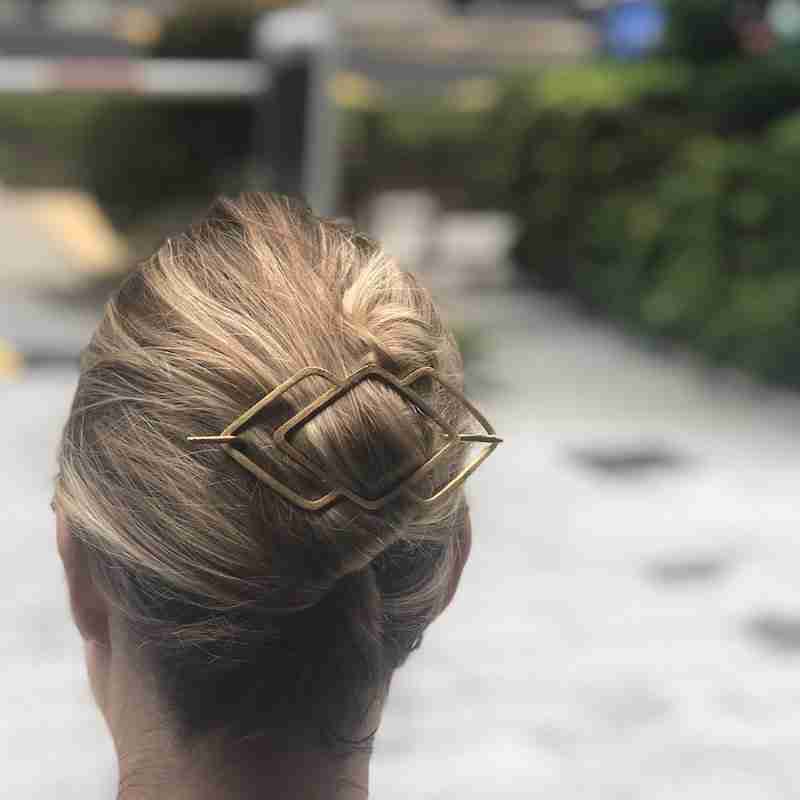 Embrassez votre nouvel état capillaire et assumez. Pour le faire avec raffinement, envisagez d’attacher votre chevelure avec une jolie barrette. On a un faible pour les bijoux de cheveux d’ElnaDesign. Elle sera présente à Boutique Fair.
