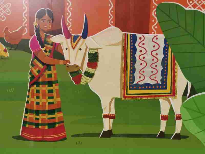 On célèbre le bétail et bien sûr les vaches! Pour tous les services rendus, le lait et le travail au champ. En Inde, les vaches sont lustrées, leurs cornes sont peintes et on les fait défiler.