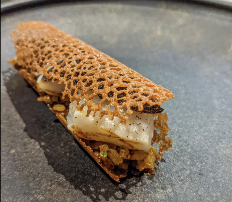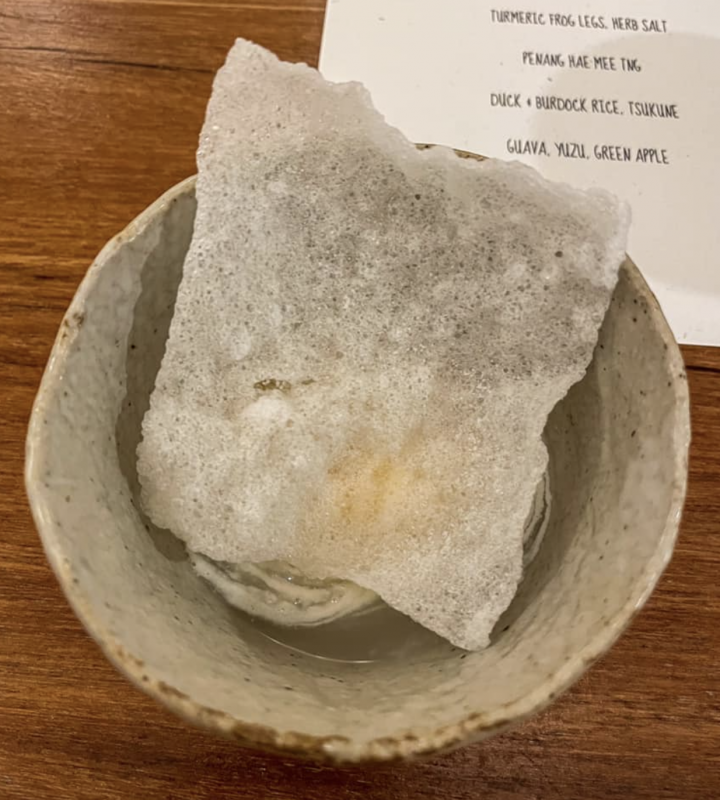 Mustard Seed, sous la régie du chef Gan Ming Kiat et sous-chef Shin Yin, propose une cuisine singapourienne moderne. L’exécution de chaque plat est impeccable. Pour Clara, les saveurs multi-sensorielles des plats sont celles avec lesquelles elle a grandi. Avec son mari, ils ont craqué sur le Rojak de calmar (rojak signifie « mélange » en malais). Le petit détail, le chef avait choisi d’utiliser du kurosato (sucre noir japonais) à la place du sucre de palme habituel. Le résultat : un plat rafraîchissant et umami. Unami est un mot japonais signifiant savoureux, on considère qu’il s’agit d’une des cinq saveurs de base avec le sucré, l’acide, l’amer et le salé.