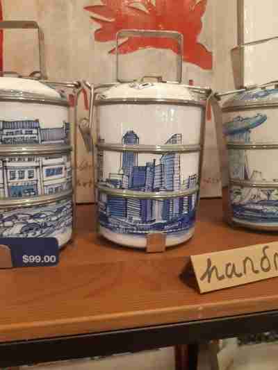 La lunch box locale sur 3 étages, en version contemporaine, bleue, décorée aux motifs des lieux clés de Singapour. La collection Boat quay est réussie.