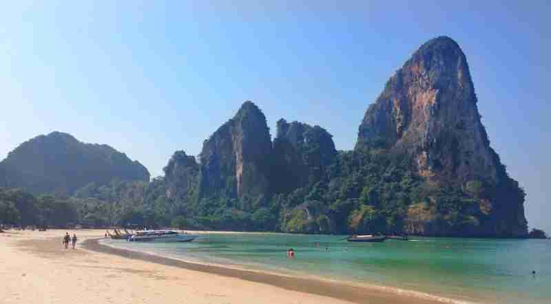 Railay Beach est au sud de Krabi. C’est une presqu’ile accessible uniquement par bateau, et donc il n’y a pas de voiture. Le paysage est magnifique avec des falaises calcaires à pic et une végétation tropicale.
