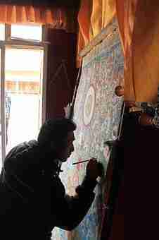 Au Tibet, les moines bouddhistes méditent et prient afin de renforcer l’esprit d’éveil et bénir le mandala, qui sera offert aux Bouddhas et à l’univers. Le mandala peut être en 3D, par exemple sculpté dans le beurre de yack. Ou en deux dimensions, composé de sable coloré déposé à même le sol. Il faut parfois des jours, voire des semaines pour le construire. Le mandala est ensuite « détruit » et le sable est rassemblé devant tout le monde pour une offrande spirituelle à une divinité.