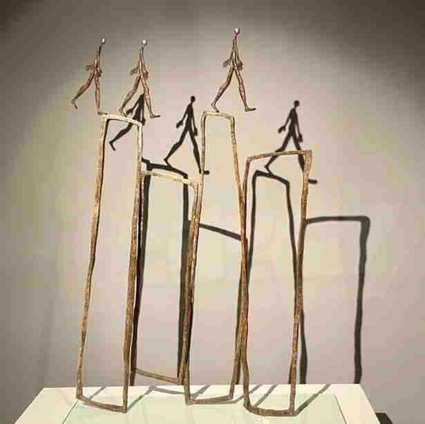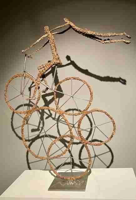 Un peu plus loin, une autre sculpture m’interpelle. On y voit un personnage, bras tendus en équilibre, au centre de plusieurs structures circulaires. En se rapprochant un peu, l’ombre qu’elle projette sur le mur donne soudain vie à ce mystérieux personnage.