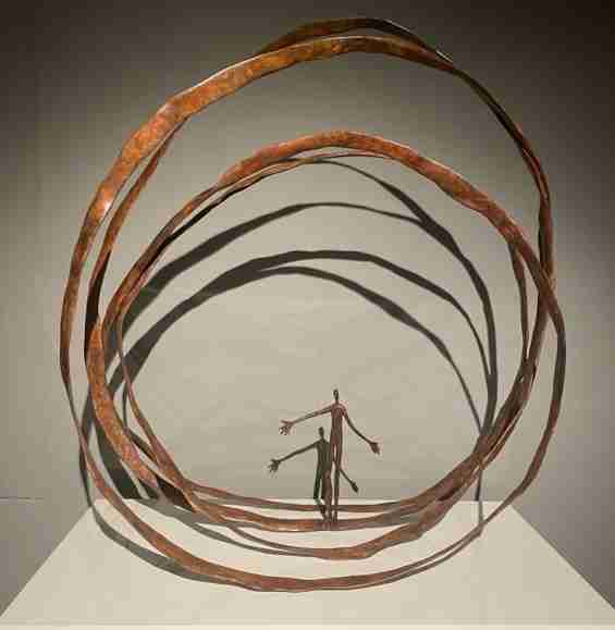 Au centre de la salle du fond, mes yeux se posent sur une imposante sculpture en métal. Elle représente deux figures, debout, l’une à côté de l’autre. Cette œuvre semble raconter une histoire d’une infinie tendresse. On ressent presque l’amour qui émane des deux personnages.