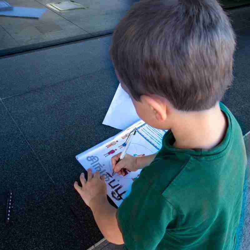 Avec des jeux adaptés qui occupent les enfants en les invitant à suivre un petit personnage du quartier. En les poussant à lever le nez pour répondre aux questions. À remplir sur place au crayon ou même finir à la maison. Ça fait un petit souvenir en rentrant.