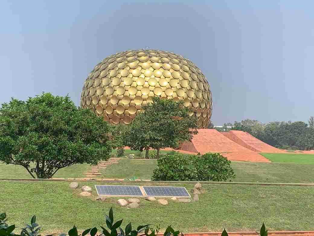 En chemin, nous nous arrêtons à Auroville, ville utopique et expérimentale créée en 1968 par une Française, Mirra Alfassa, plus connue sous le nom de la « Mère« , qui fut la compagne du philosophe et maître spirituel Sri Aurobindo. La ville a pour vocation d’être le lieu d’une vie communautaire, où hommes et femmes apprennent à vivre en paix. Le gouvernement indien en a repris la gestion il y a quelques années.