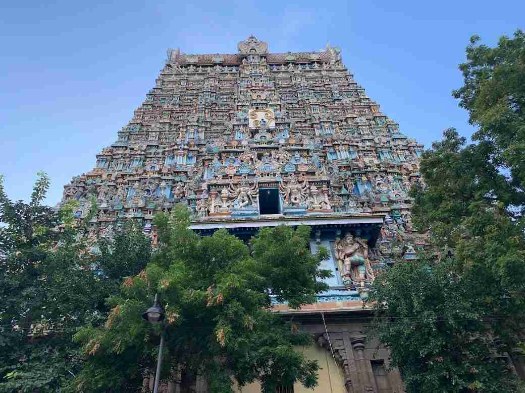 Madurai, une des plus grandes villes-temples du sud de l’Inde, abrite le célèbre temple de Meenakshi. L’immense, le prodigieux, l’extravagant temple de Meenakshi, est l’exemple le plus exubérant de l’évolution tardive de l’architecture « foisonnante » des temples de l’Inde dravidienne avec ses douze gopurams de 50 mètres de haut recouverts d’une profusion de représentations colorées de divinités, d’animaux et de personnages sacrés.