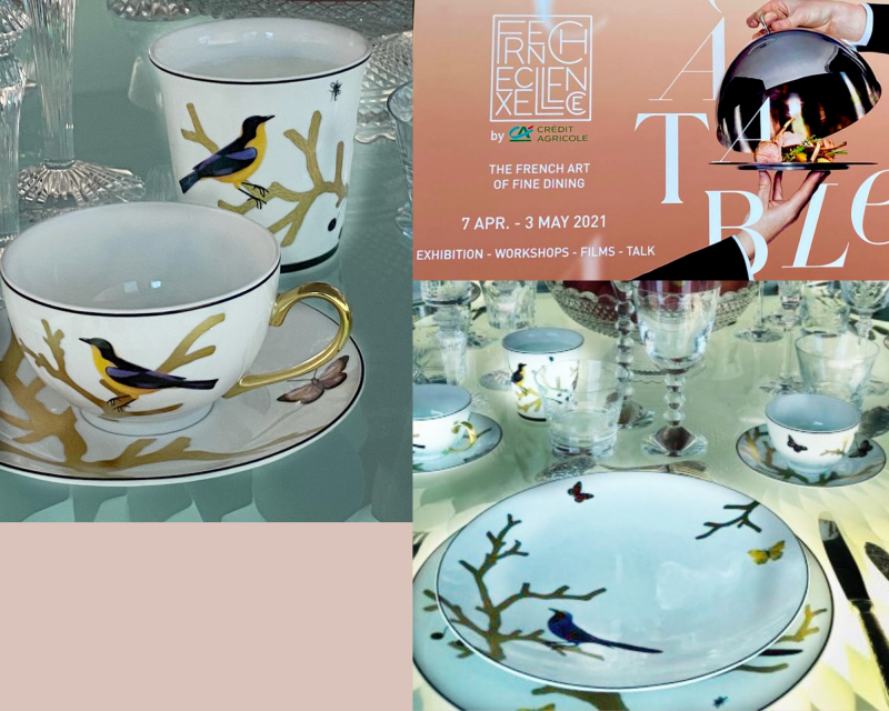 Vous trouverez à l’Alliance Française trois belles tables dressées pour un diner raffiné et une collection de menus historiques reliant la France et l’Asie du Sud-Est. Christofle, Baccarat, Bernardaud et le Fond Gourmand de la Bibliothèque municipale de Dijon ont contribué à cette expo À Table ravissante et instructive.