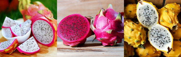 - Le dragon fruit rouge à chair blanche : plutôt de forme ovale, chair un peu gélatineuse et très rafraichissante avec des graines noires, texture et goût du kiwi. Sans doute le plus répandu sur les étals. Dans les rayons de tous les supermarchés, souvent moins cher qu’au marché.