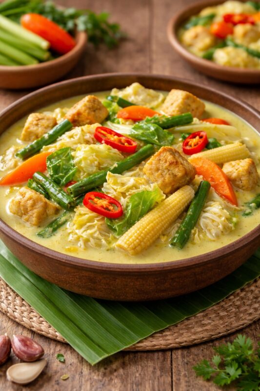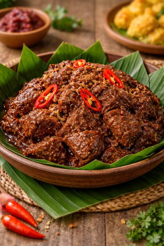 Le plat emblématique, c’est le rendang : une viande : bœuf ou poulet, mijotée lentement dans un mélange de lait de coco, de citronnelle, de galanga et d’épices, jusqu’à ce que la sauce caramélise et enrobe chaque morceau. Il se sert traditionnellement avec le ketupat, un gâteau de riz compressé cuit dans des feuilles de palmier tressées présent sur chaque table de Hari Raya. À leurs côtés, on trouve souvent le sayur lodeh, un curry de légumes au lait de coco, et le lontong, riz compressé servi avec une sauce épicée aux légumes.