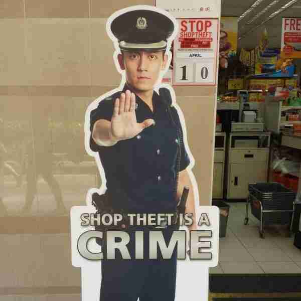 Connaissez vous le Yandao? C’est le surnom du beau policier en carton à l’entrée des magasins. Yandao signifie « beau » en hokkien et en singlish.